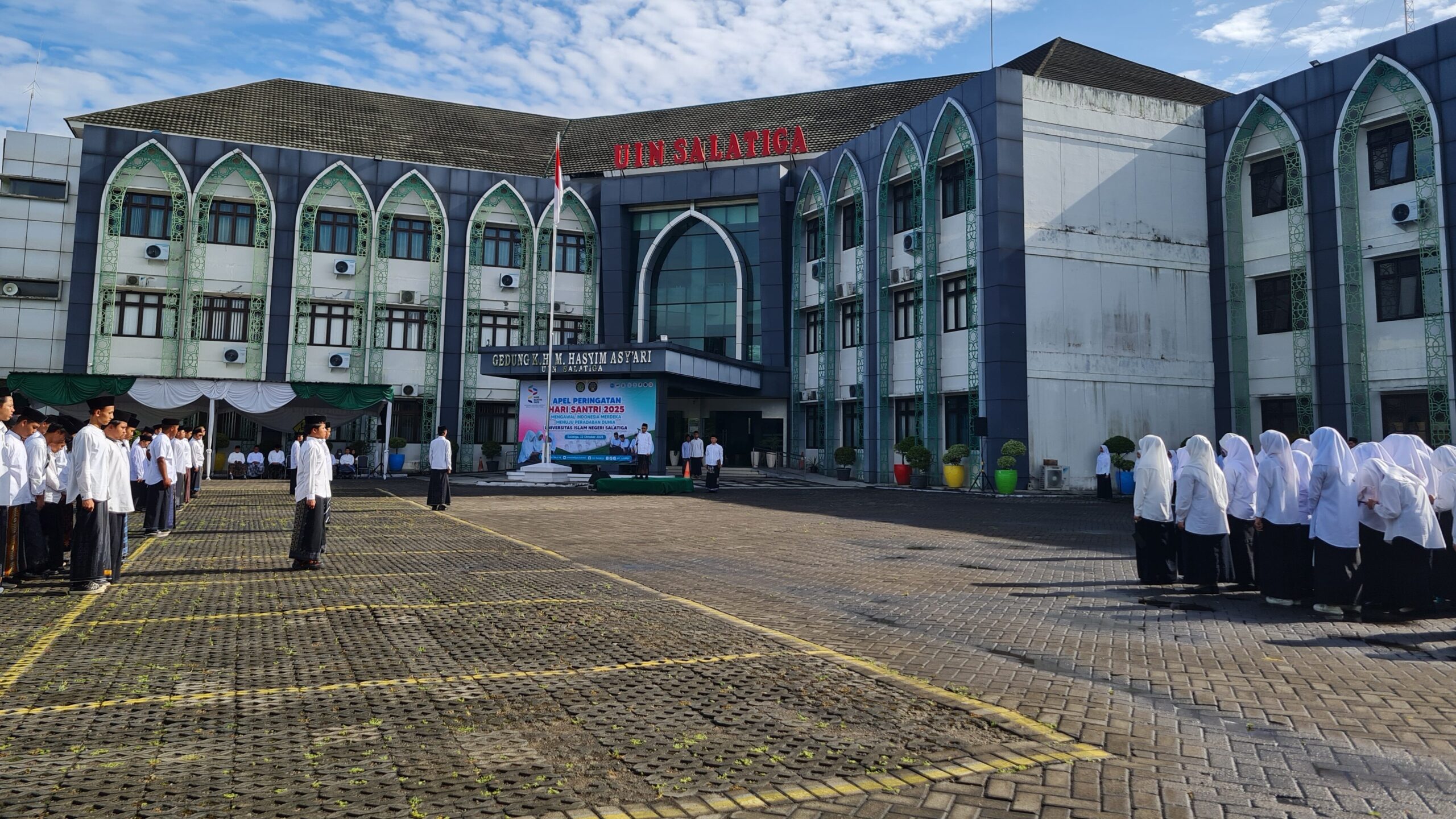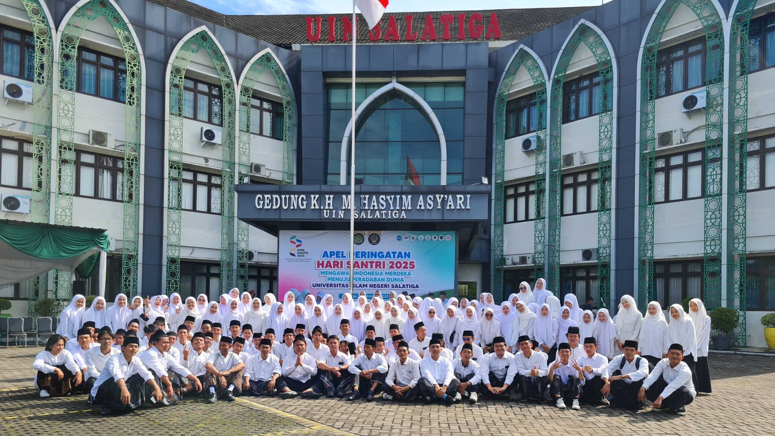 SALATIGA-Menteri Agama RI, Prof. Nasaruddin Umar meminta santri untuk berdaya dan aktif menjadi pelaku sejarah. Hal itu dibacakan Rektor UIN Salatiga, Prof. Zakiyuddin saat Upacara Hari Santri, Rabu (22/10). Upacara yang digelar di halaman Gedung KH. Hasyim Asyari tersebut diikuti oleh tenaga pendidik, tenaga kependidikan, dan santri dari Ma’had Al-Jami’ah UIN Salatiga.