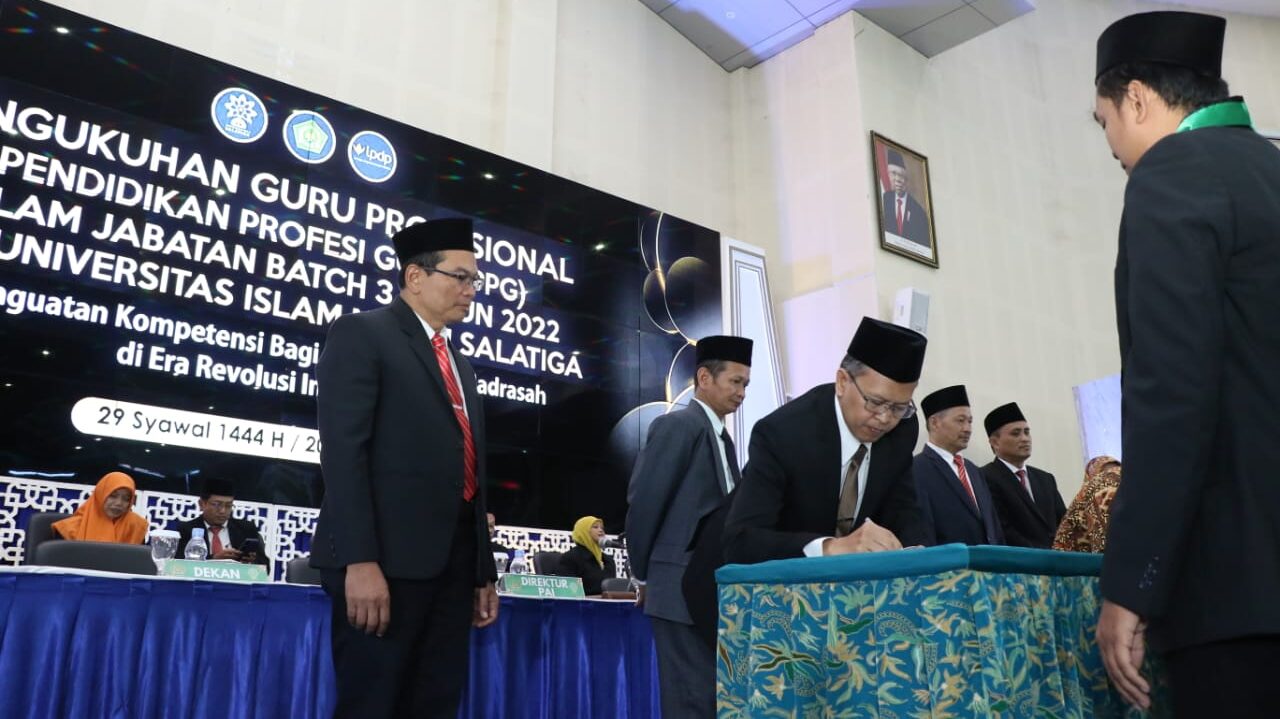 SALATIGA-Lembaga Pendidikan Tenaga Kependidikan (LPTK) Universitas Islam Negeri Salatiga berhasil meluluskan 410 orang peserta. Upacara Kelulusan dan Pengukuhan Guru Profesional Pendidikan Profesi Guru (PPG) dalam Jabatan Batch 3 digelar di Gedung Auditorium dan Student Center Kampus III pada Sabtu (20/5).